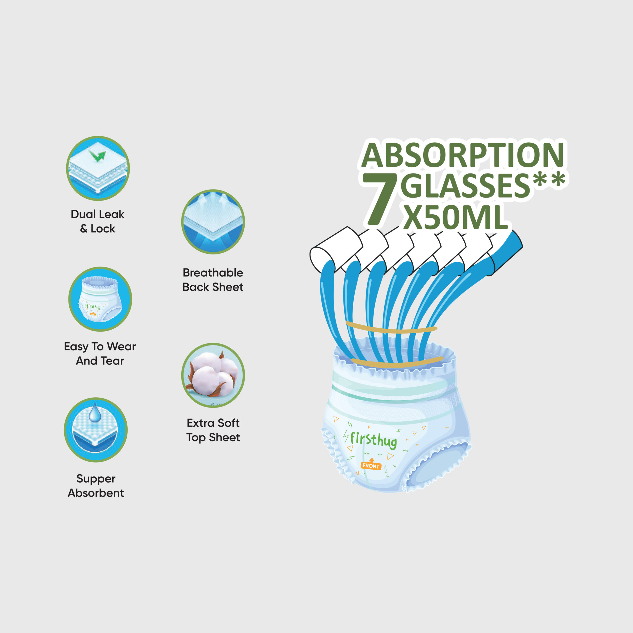 Quick absorbent, Extra soft top sheet, Dual Leak & Lock, Breathable back sheet