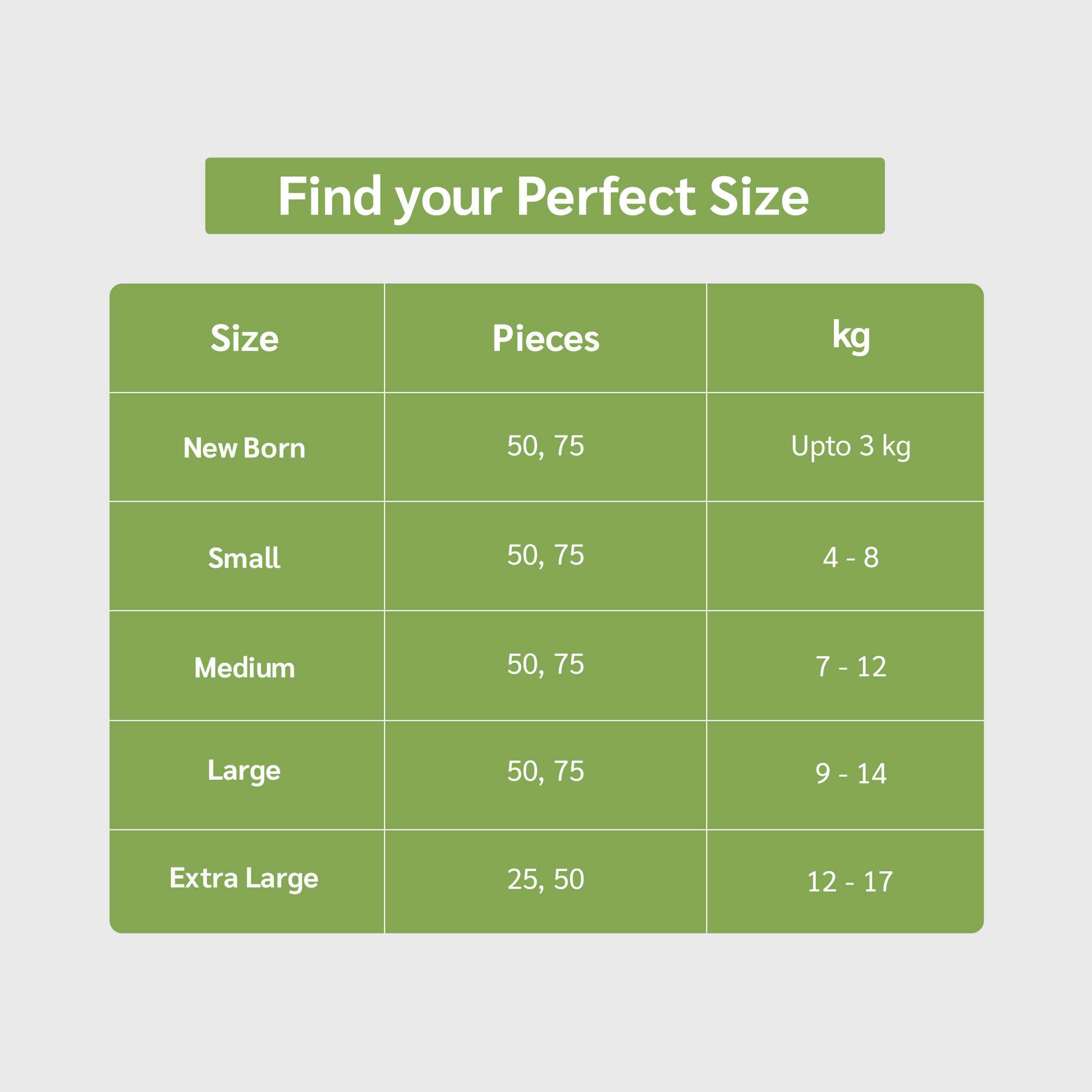 New born, Small, Medium, Large, Extra Large